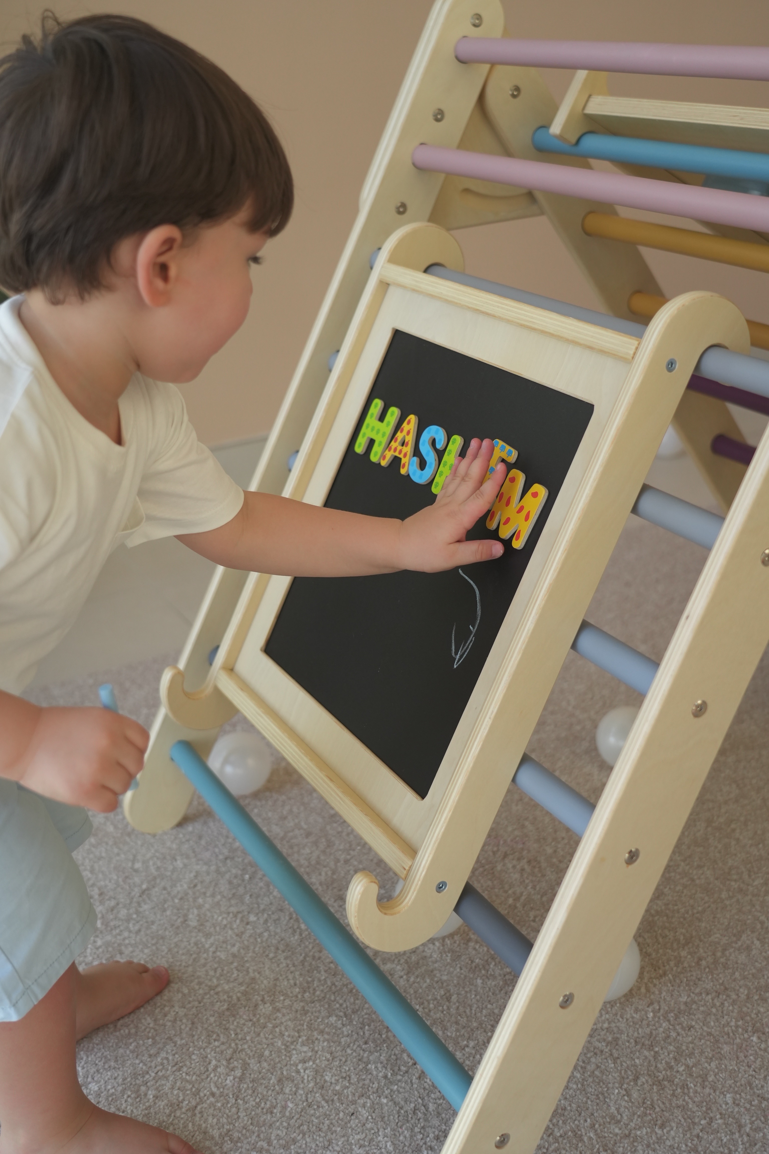 Turn your child's Pikler setup into a creative learning zone with the Ezzro Double- Sided magnet Chalkboard. Designed to fit seamlessly with Ezzro's Pikler Triangle, this reversible board offers two sides of endless play.