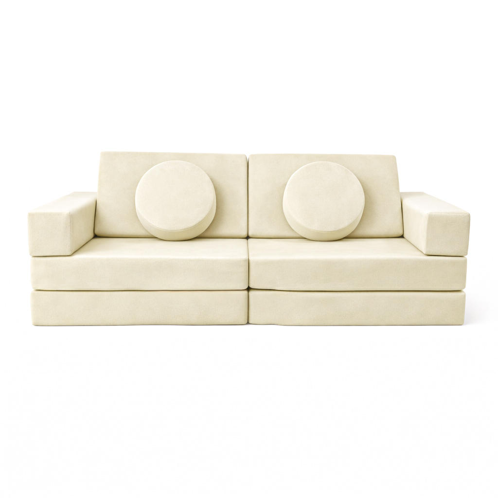 Available on Preorder. Ezzro Play Sofa Circle Bundle is a 10-piece modular play sofa that transforms into multiple play and seating configurations. Made with high-quality Lux Velvet fabric certified by Oeko-Tex, it is free from allergens and safe for children. The sofa features a low-pile, non-slip velvet finish with a modern look, produced using only ecological paints. Ezzro uses firm, high-density foam designed for durability and long-term use. Ideal for imaginative play, lounging, and building activities, the sofa easily converts back into a compact, stylish couch and can also be used as a comfortable sleepover bed for kids.
